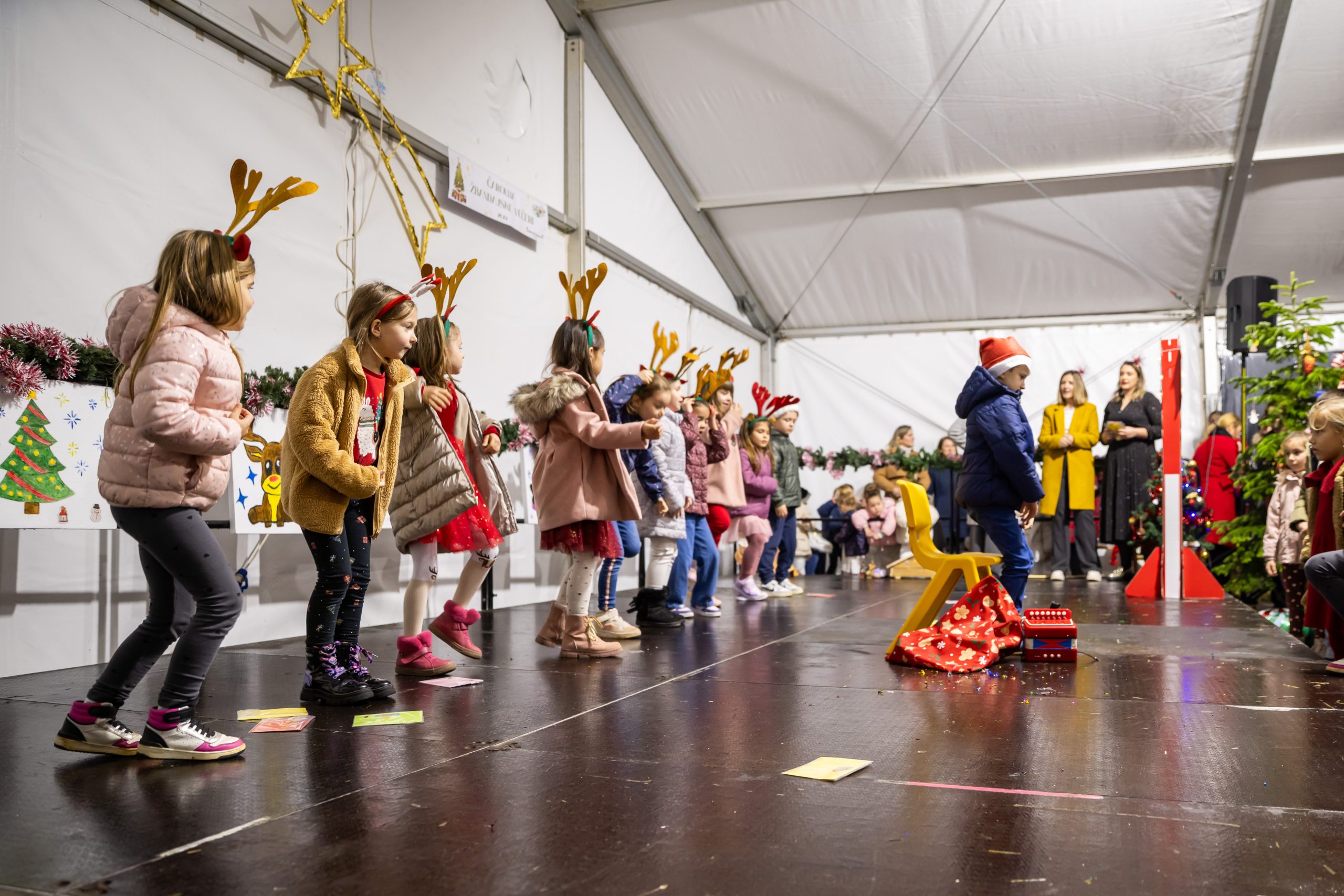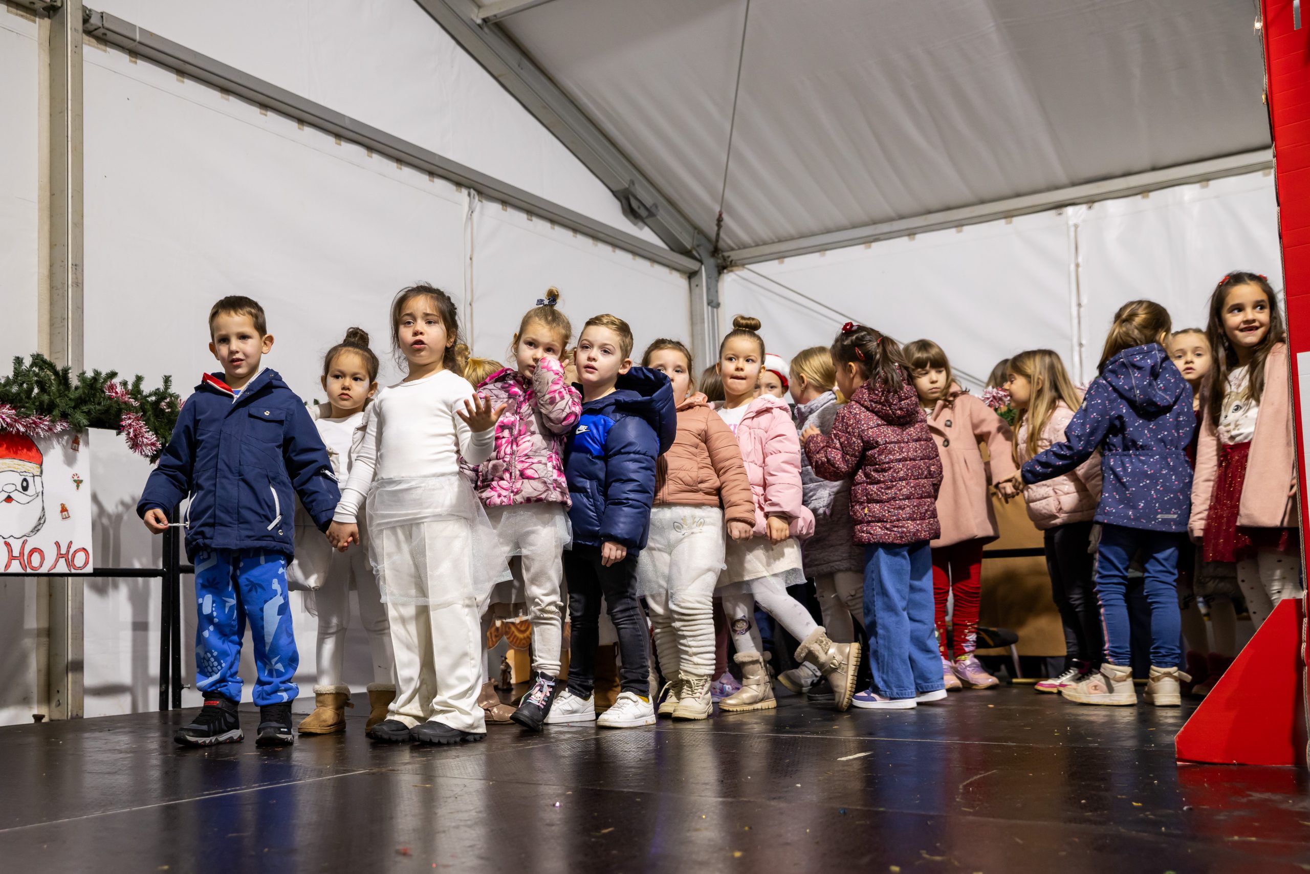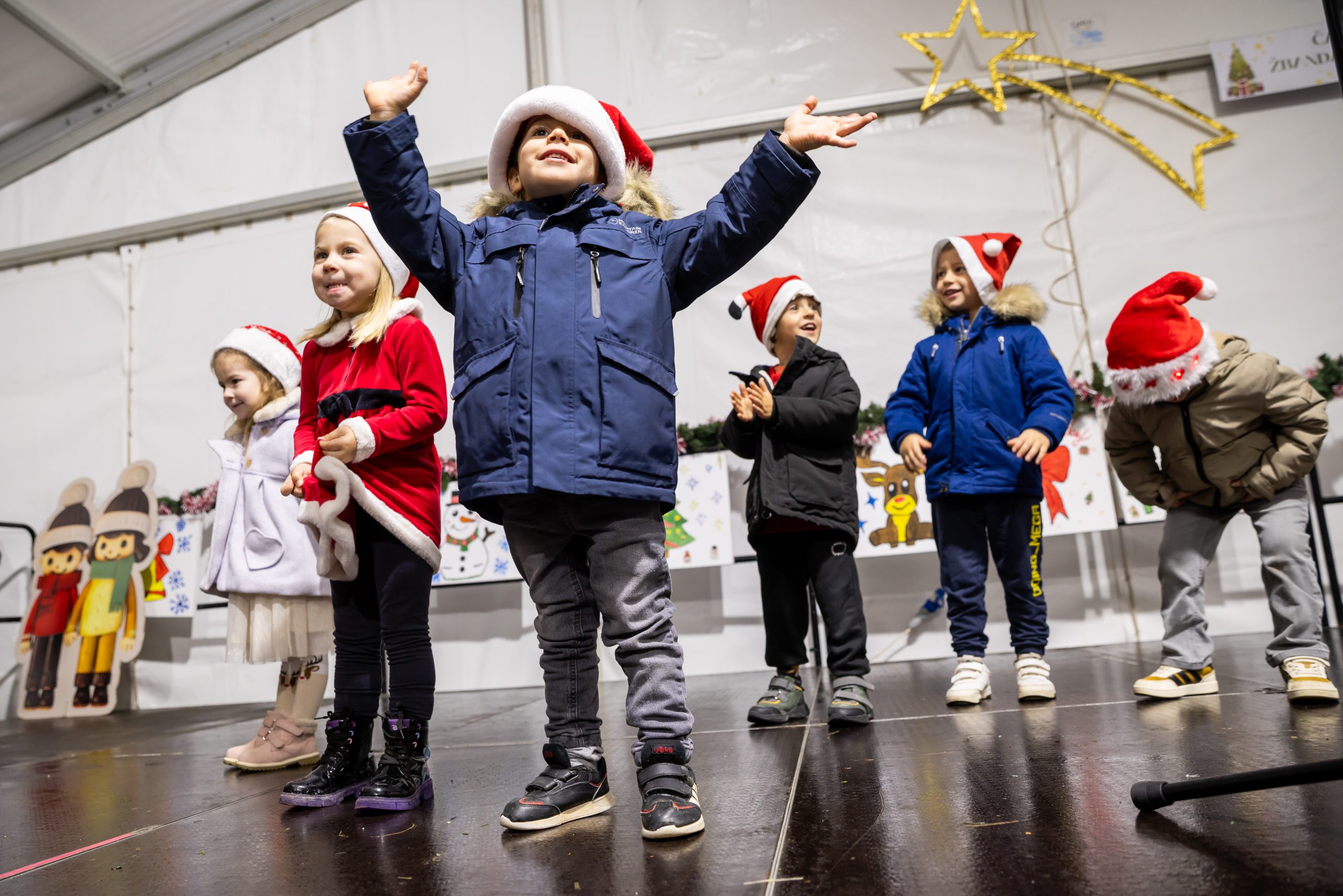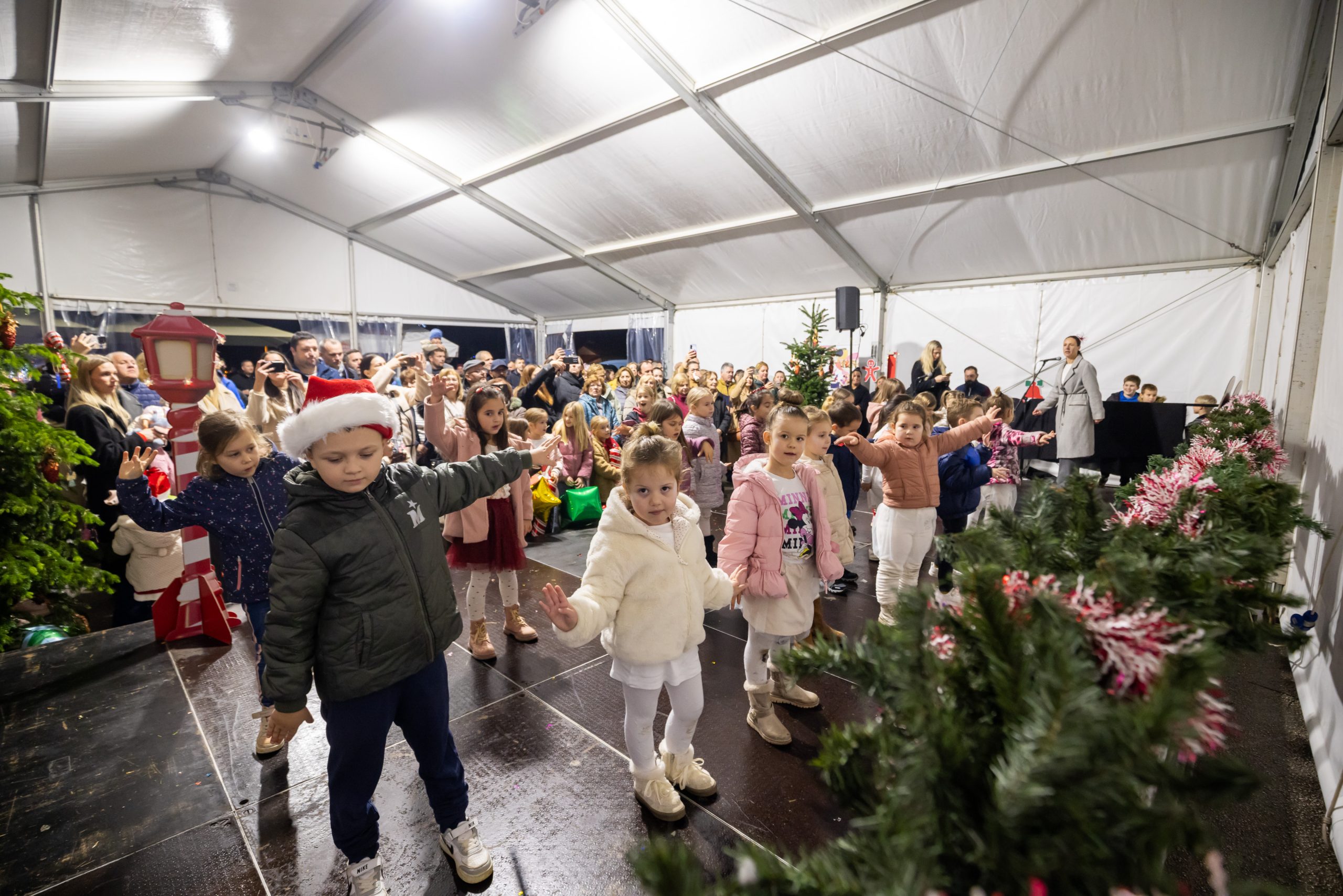 Krenuli su nastupi mališana – najmlađi vrtićarci Lavići ponosno su predstavili svoj ples „Djed Mraz stiže u naš grad“.